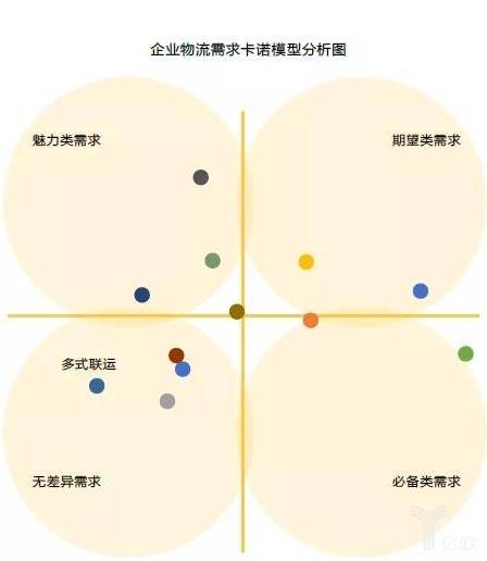 第一,貨主企業對多式聯運的需求不強烈。雖然近年來國家相關部門頒布了多項政策,大力推動多式聯運發展,但是據調研的數據顯示(如圖所示),多式聯運被貨主企業視為無差異類需求,即無論提供或不提供此服務,貨主企業的滿意度都不會改變,貨主企業不在意此類服務;貨主企業更在意的仍是成本控制、效率保障、響應速度、貨損水平等因素。因此,國家政策鼓勵與支持,更多影響的是國有企業的運輸操作模式,而大量非國有企業因對多式聯運的忽視,會使之缺乏長期發展動力,一旦國家政策的支持力度減弱,多式聯運將很有可能陷入慘淡經營的境地。